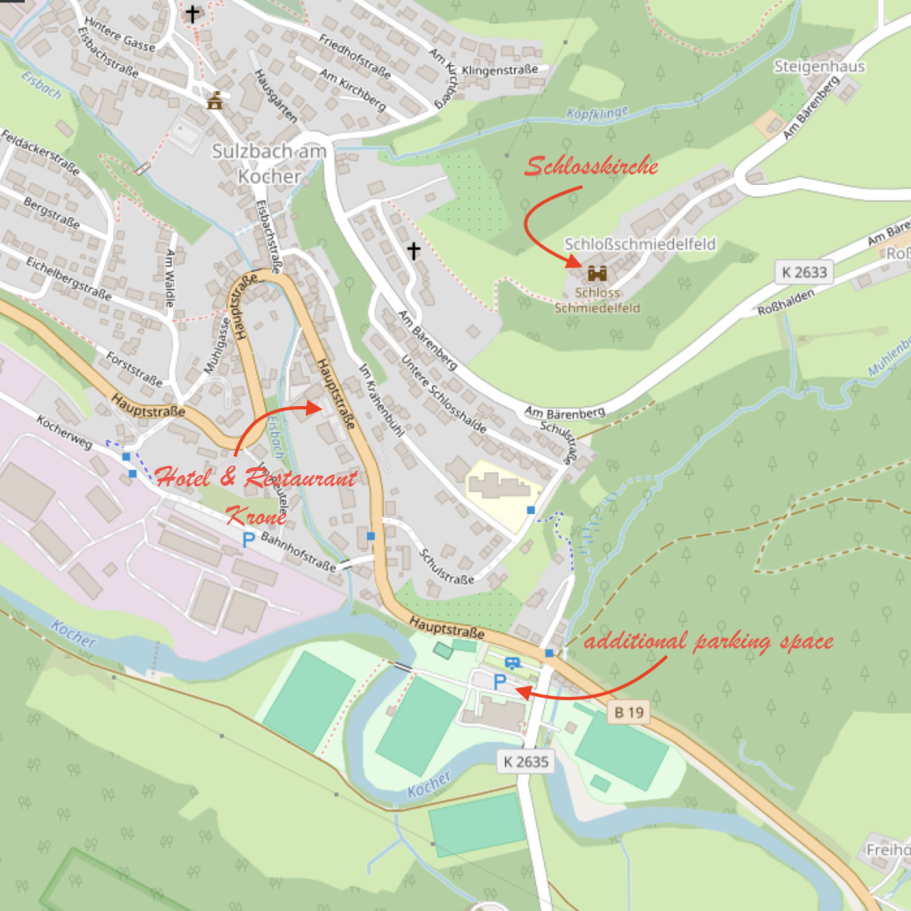 A shuttle will run every 5-10min from about 2:15pm to the venue from the Hotel Krone. If you are staying in another Hotel in Sulzbach-Laufen feel free to reach out and we can pick you up there.